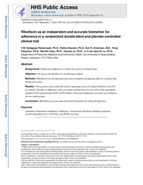 Riboflavin as an independent and accurate biomarker for adherence in a randomized double-blind and placebo-controlled clinical trial.